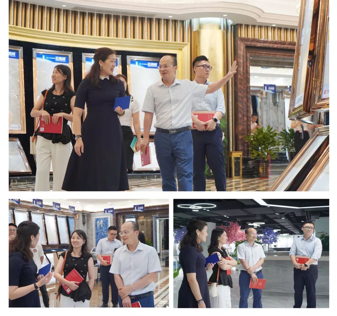 隨后,碧桂園團隊在方向企業董事總經理劉麗燕的帶領下參觀了展廳,實地觀摩方向企業各類產品,從石代臻品、可麗雅I PLUS大板、可麗雅二代13.5mm、CLEAIR+可麗雅空氣凈化磚、至尊白系列、云瓷片系列、通體大理石等系列產品,碧桂園團隊對產品贊口不絕,不時詳細詢問,并拍照留影。
