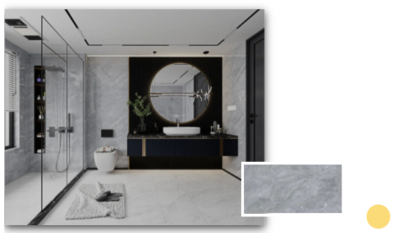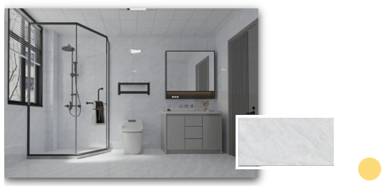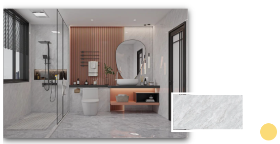安道爾橙格柵背景+水云灰通體瓷拋石中板的溫暖搭配,令一個(gè)舒適的浴室環(huán)境躍然而上。扇形的鏡面設(shè)計(jì)配以及暖色調(diào)條形燈,不僅契合當(dāng)下年輕人的空間審美,更煥發(fā)出不一樣的青春活力。