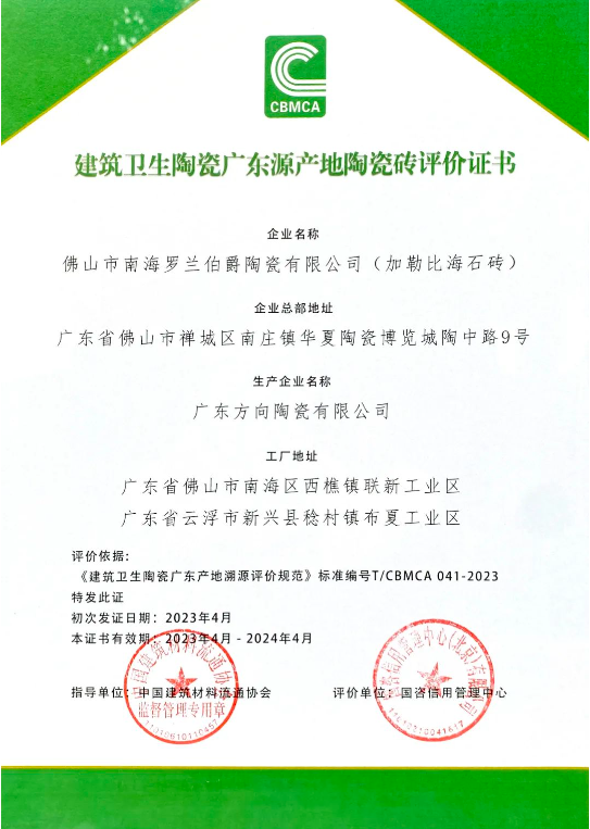 2023行業兩會|加勒比海石磚瓷磚榮獲“建筑衛生陶瓷廣東源產地陶瓷磚評價證書”