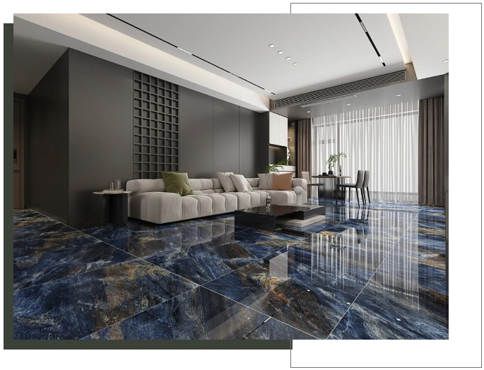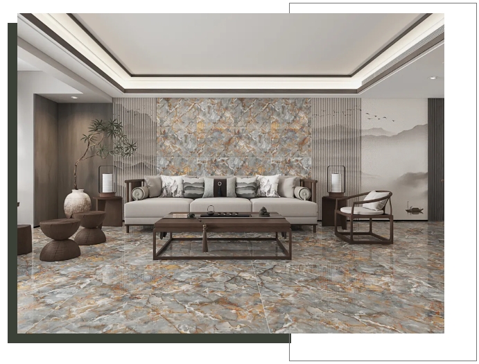 客廳選用【密爾沃】通鋪于地面,以灰色為客廳的主調,恣意流淌的精致紋理,與窗外陽光交織互動,呈現高級、沉穩的雅致氛圍。